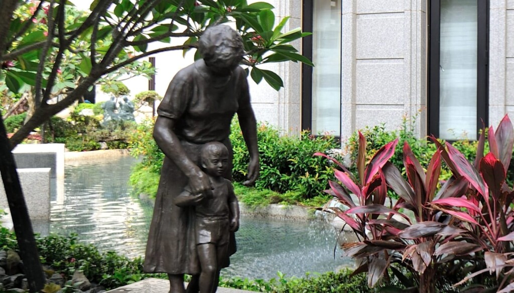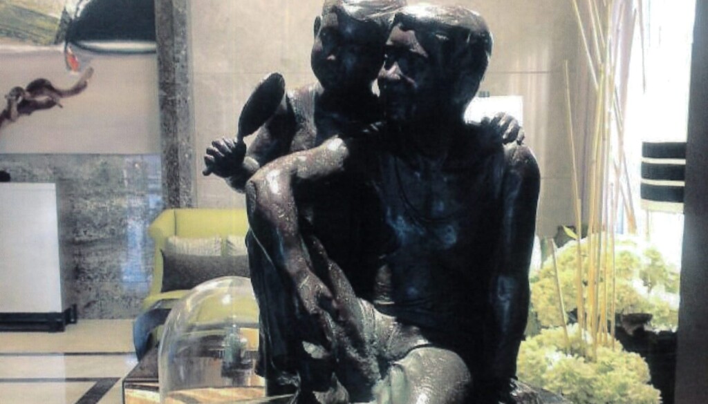 怡然自得 At ease 作者:廖述乾說明:此件作品表露父與子的和樂,談天說笑、搖扇乘涼,展現平凡知足的感恩之